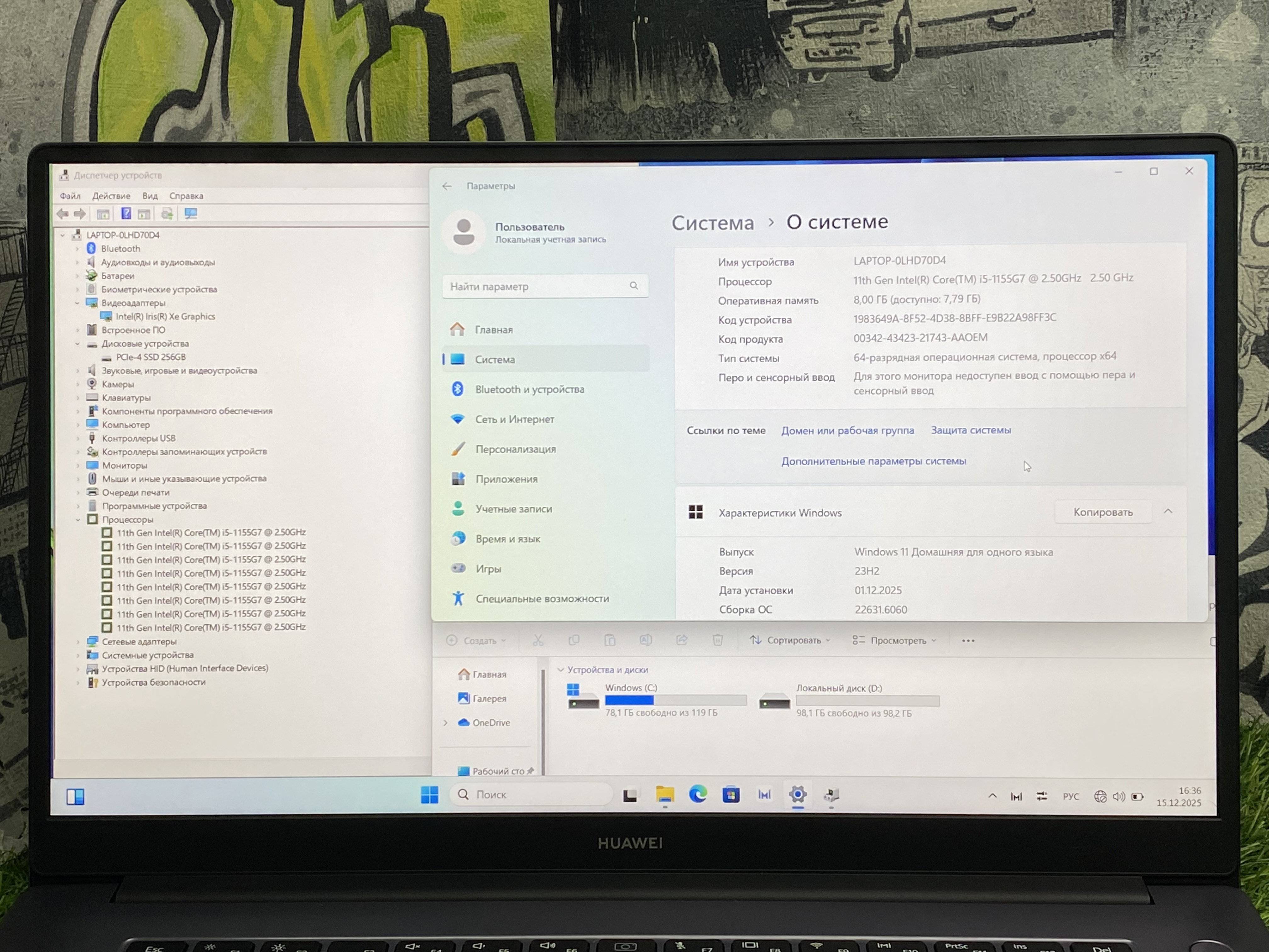 Ноутбук Huawei MateBook D 15 BoD-WDH9 [53013vav], 15.6", IPS, Intel Core i5 1135G7 2.4ГГц, 4-ядерный, 8ГБ DDR4, 256ГБ SSD, Intel Iris Xe Graphics